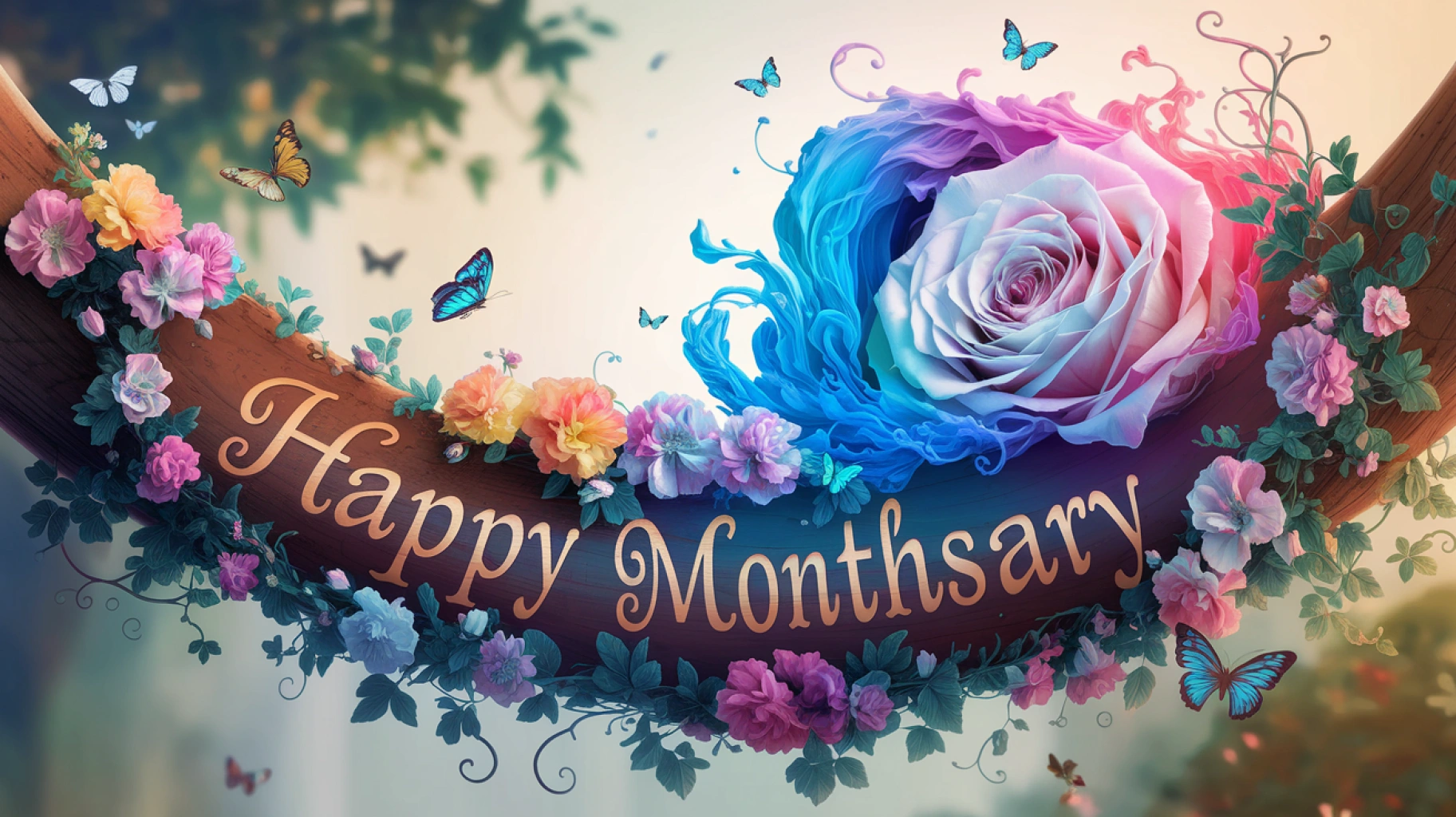 Ideogram AI Prompt提示词 A 12K high definition render illustration of a wooden curve with the name "Happy monthsary " carved into it. The curve is adorned with multicolored flowers and butterflies. A blue and pink-purple color of swirling wave-like effect that give the image a stunningly detailed and artistic representation of a glowing multicolored rose with beautiful petals intertwined with the vines of leaves and torns are partially obscured by the foliage of the image. The background is a soft blur of greenery. The overall image has a warm hue. 中文大意:一张12 K高清渲染插图,描绘了一条木制曲线,上面雕刻着“Happy Monthsary”的名字。曲线上装饰着五彩缤纷的花朵和蝴蝶。蓝色和粉紫色的漩涡波浪状效果,为图像提供了令人惊叹的详细和艺术化的表现,展示了一朵发光的彩色玫瑰,美丽的花瓣与叶子和伤口的藤蔓交织在一起,部分被图像的叶子遮挡。背景是柔和的绿色植物。整体图像具有温暖的色调。 |